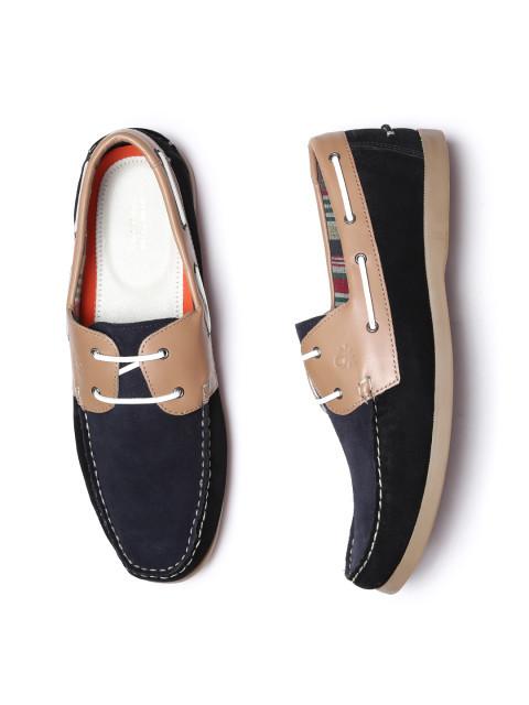A couple of black and beige colourblocked boat shoes, has focal trim ups.Leather upper, has ribbon and eyelet detail along the mouth and a strengthened heel neckline padded footbed.Textured outsole with designed notches.